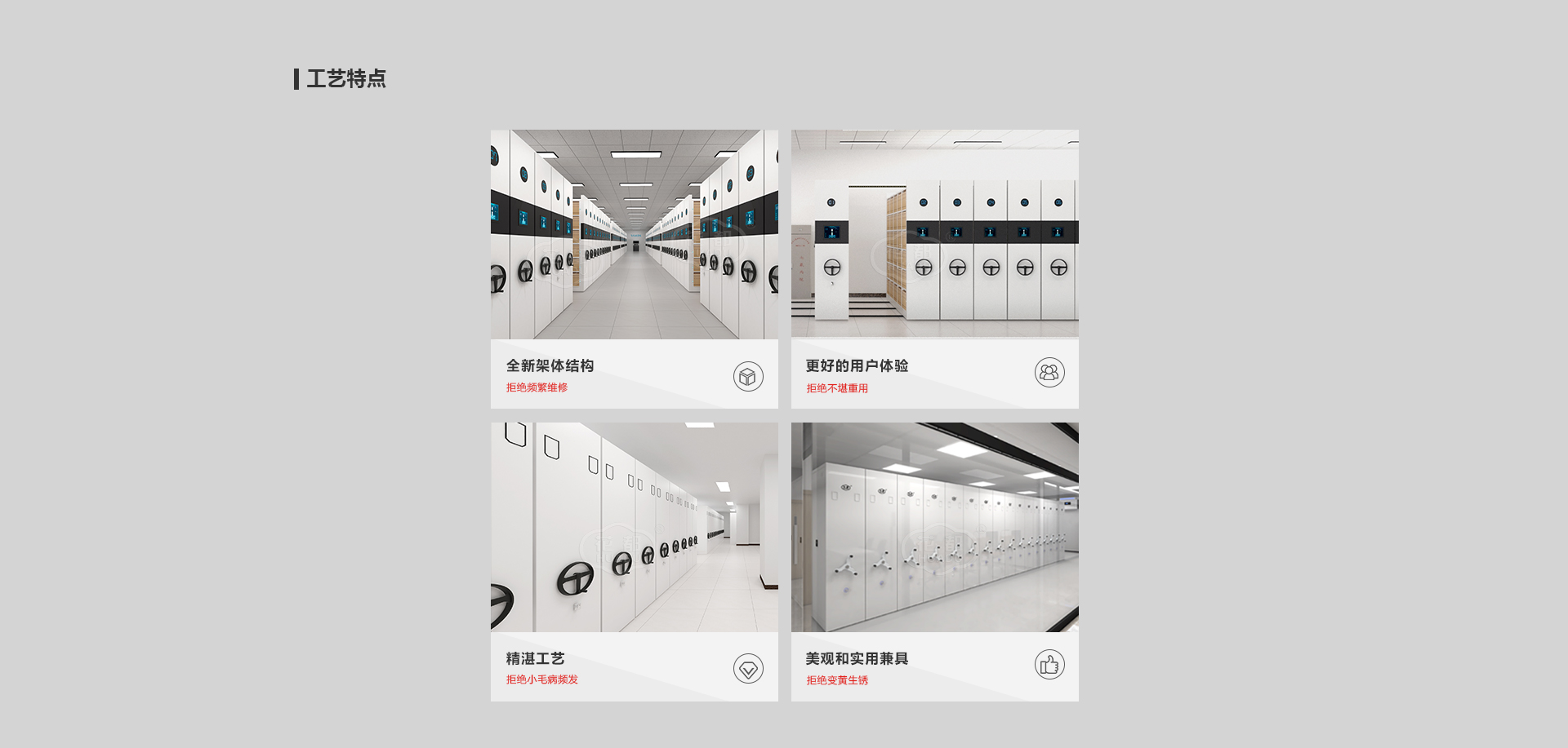 表面處理: 花都自主研發(fā)400米長大型密集架噴涂線,架體經(jīng)預(yù)脫脂、主脫脂、清洗、水洗、表調(diào)、陶化、鈍化、水洗、烘干、冷卻、靜電噴涂、固化、冷卻十三道工序前處理,靜電自動噴粉,高溫固化而成,提高其防銹蝕、防變色性能,密集架表面光滑有質(zhì)感。