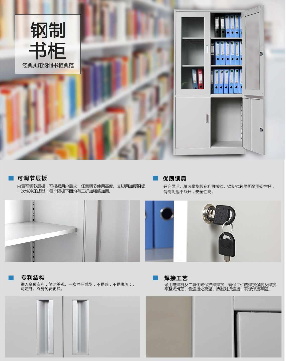 鋼制書柜經(jīng)典實用鋼制書柜典范可調(diào)節(jié)層扳內(nèi)置可讕節(jié)層板,可根據(jù)用戶需求,任意節(jié)使用高度。支腳加厚鋼板一次性沖壓成型,麗個隔板下面均有三折加強箭加固。專利結(jié)構(gòu)斜入多項專利,簡潔美一次沖壓成型,不易碎,不易脫落,可定制。終身免更換。優(yōu)質(zhì)鎖具開靈活。精選豪華版專利機械鎖。鋼制鎖芯堅固耐韌性好,鋼制鑰匙不互開,安全性高。焊接工藝采用電埠機及二氧化碳保護悍接,確保工件的焊接強度及接平整光滑頂、側(cè)連接處高溫、熱對扌斤連接,確保接牢固。