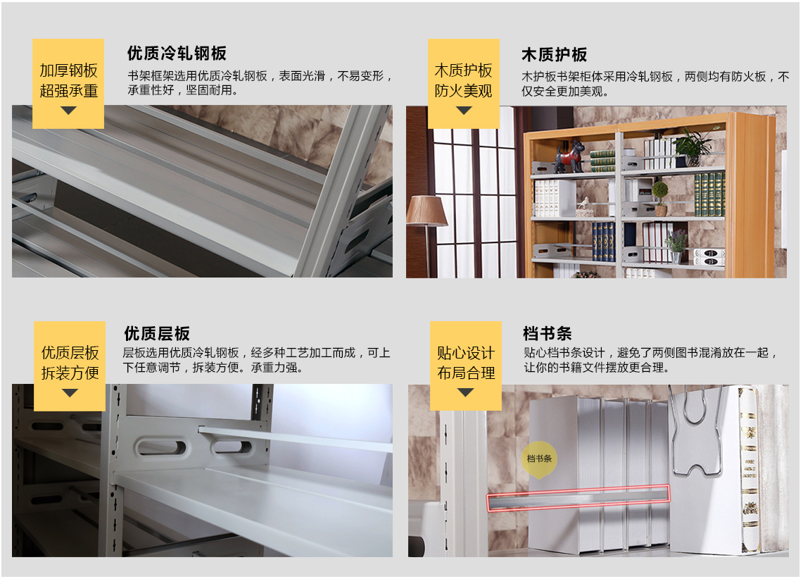 加厚鋼板超強承重優(yōu)質(zhì)層板拆裝方便優(yōu)質(zhì)冷軋鋼板書架框架選優(yōu)質(zhì)冷軋鋼板,表面光滑,不易變形,承0性好,堅固的用。優(yōu)質(zhì)層板層板選甲優(yōu)質(zhì)冷軋謳板,經(jīng)多種工藝加工而成,可上下任意調(diào)節(jié),拆裝方便。承重力強。木質(zhì)護板防火美觀貼心設計布局合理木質(zhì)護板木護板書架柜體采用冷軋鋼板,兩側(cè)均有防火板,不僅賓全更加萋觀。檔書條貼心檔書條設計,擗免了兩側(cè)圖書混淆放在一起,讓你的書箱文件擺放更合理。檔書條